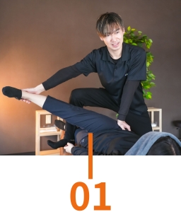 まず始めに丁寧なヒアリングの元、骨格構造・骨の配列・各関節の可動域などから評価分析を行い、一人一人に合ったオーダーメイドのストレッチ施術を行います。